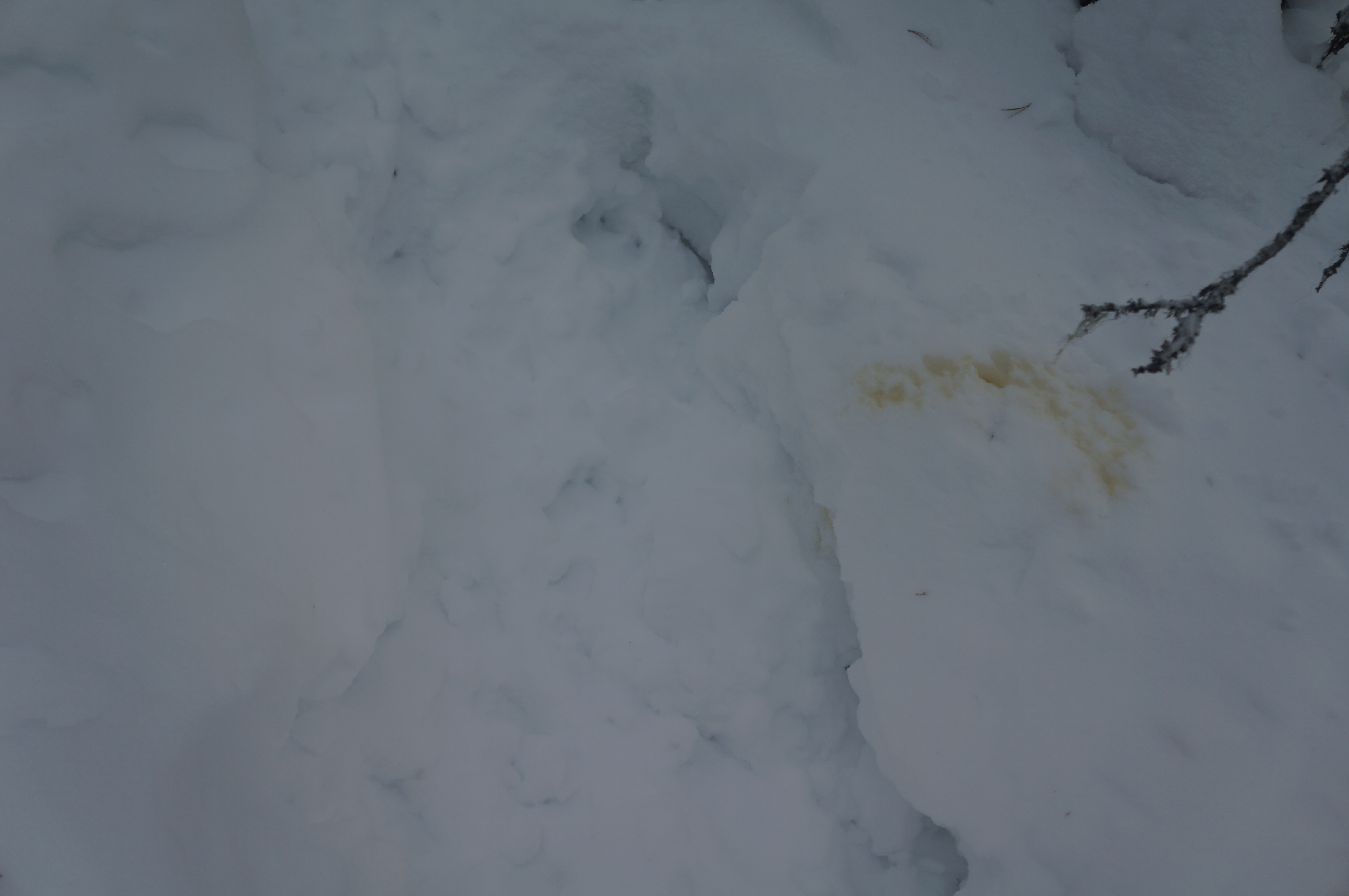 Идя в очередной раз по траншее оленей, наткнулись на волчий след и мочевую метку (рис. 3), середина февраля – время гона.